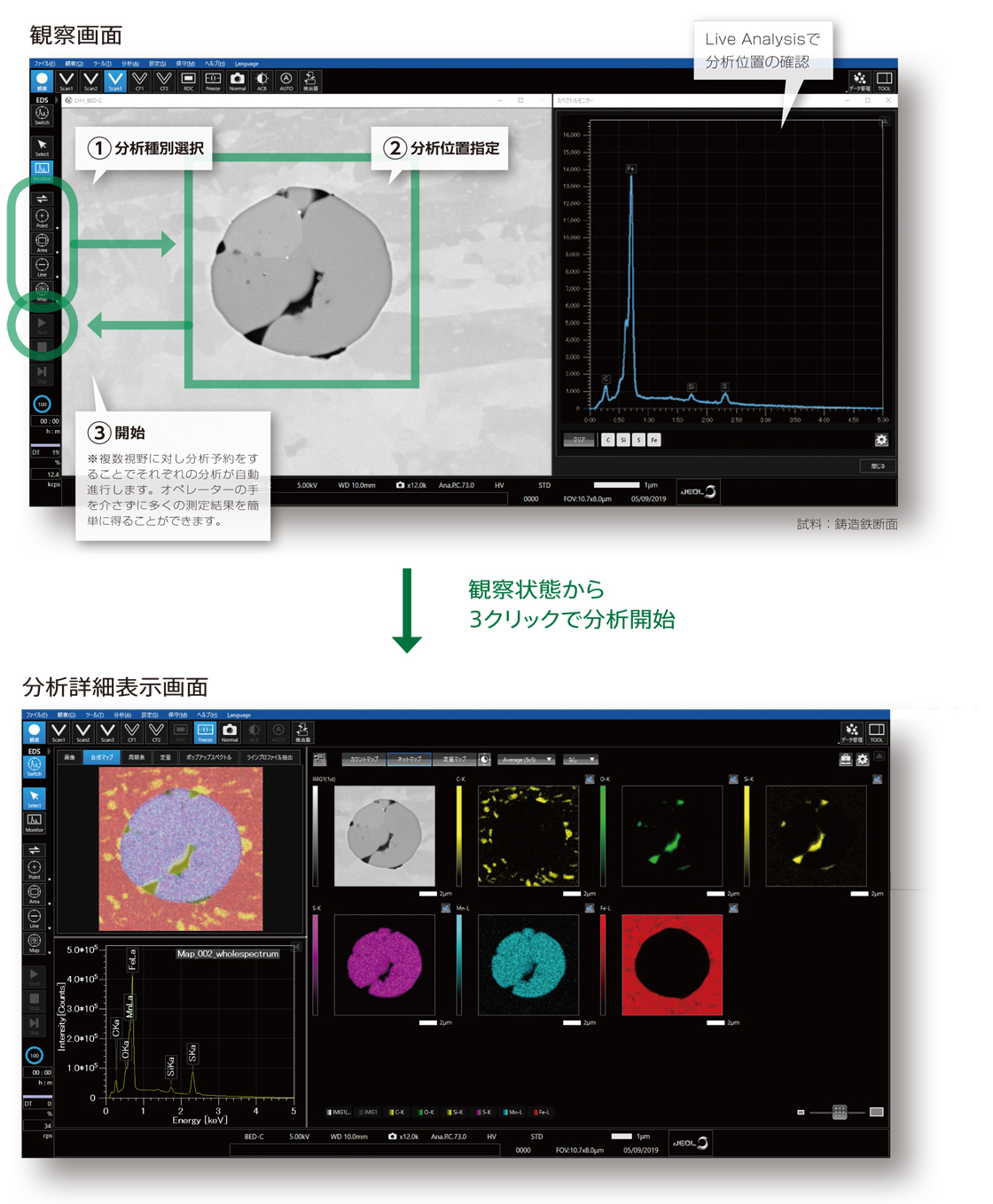 JSM-IT800は、高分解能観察を実現するための "インレンズショットキーPlus電界放出形電子銃" と次世代型電子光学制御システム "Neo Engine"、高速度元素マッピングを実現するために使いやすさを追求したGUI "SEM Center" に自社製EDSを組込んだシステムを共通のプラットフォームとしています。
