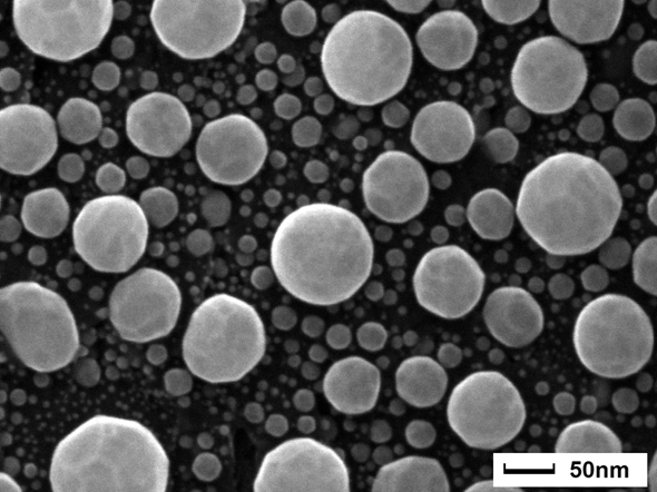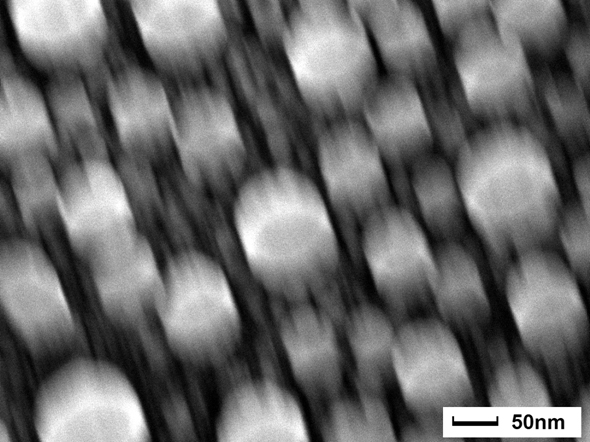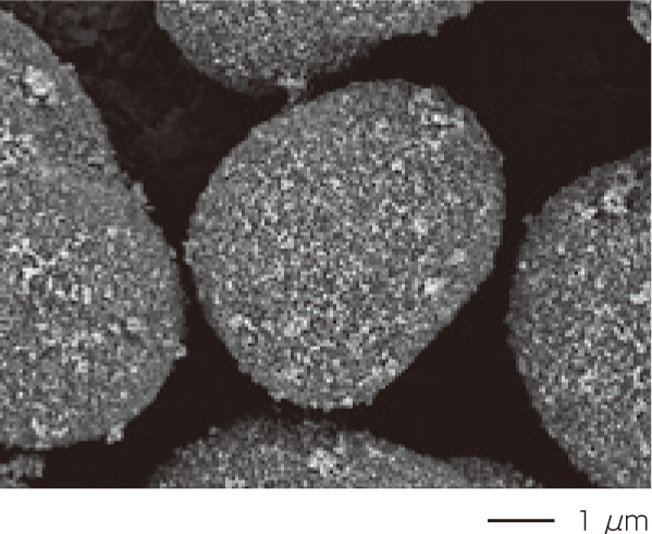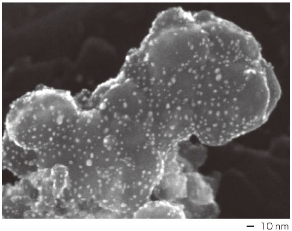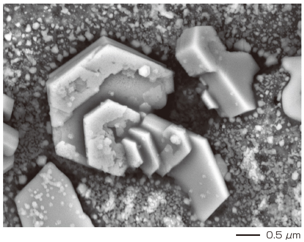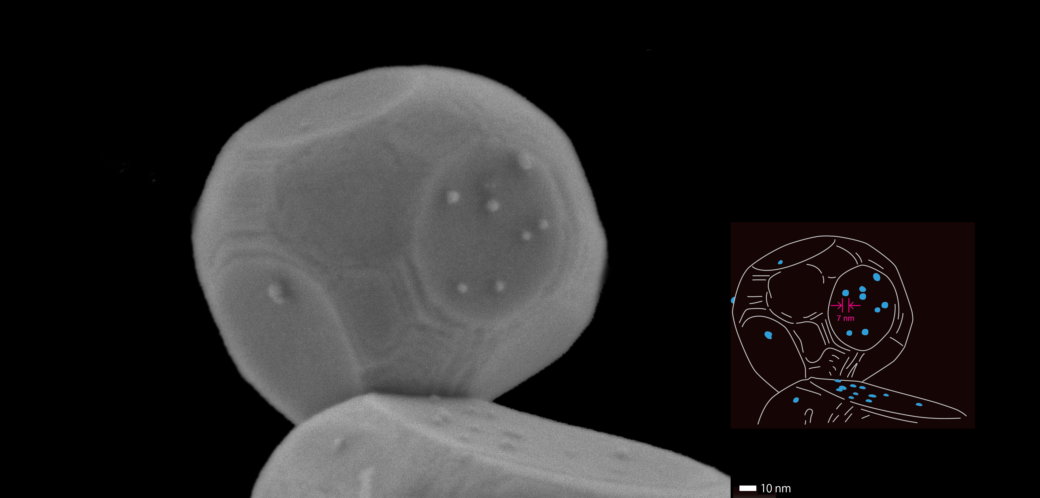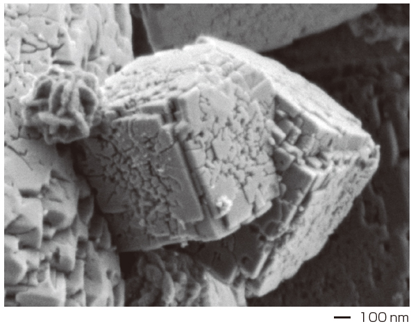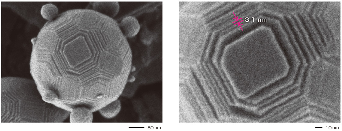 水の電気分解にかかる量子効率がほぼ1に近い光触媒です。高分解能二次電子像では、立方体の粒子の {100} 面に10 nm以下の 水素生成助触媒粒子が選択的に付着している様子が確認できます。
