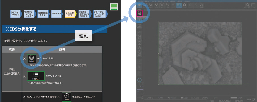 説明に従いスマイルナビ内のアイコンをクリックするとSEMの操作画面が連動します。必要な操作手順やボタンの配置をSEMの操作画面に対して示してくれるため、将来的にスマイルナビなしでの操作の習得が期待できます。