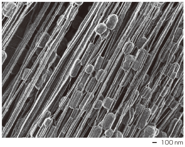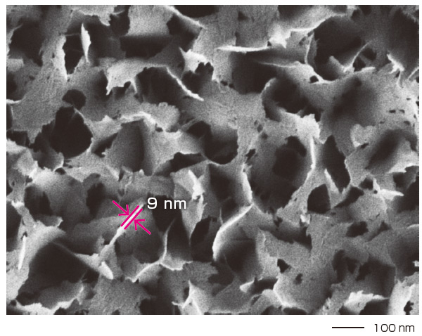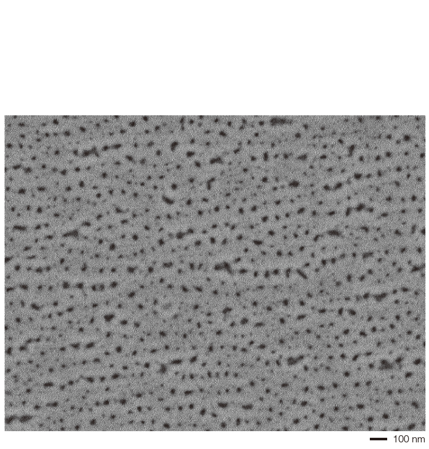 観察条件: 入射電圧 5 kV、WD: 4.5 mm、観察モード: LV (50 Pa)、検出器: LVBEDナノサイズの細孔を帯電の影響なく観察できている。