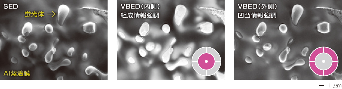新しい2種類の反射電子検出器 (オプション) であるシンチレーター反射電子検出器 (SBED) は応答性に優れ、また低加速電圧での材料コントラスト像の取得に有利です。多目的反射電子検出器 (VBED) は分割された検出素子形状により、3Dや凹凸など特色ある画像を取得できます。